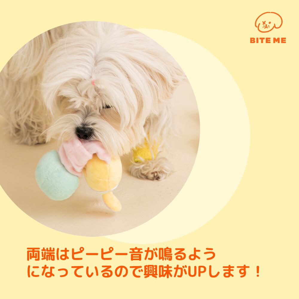 中にゴムバンドが入っている伸縮性のあるおもちゃ。引っ張りっこ遊びでワンちゃんが夢中に!両端はピーピー音が鳴るので、音が鳴るおもちゃが好きなワンちゃんにおすすめ。ワンちゃんの犬種や体型を問わずに遊べるおもちゃなので、ギフト需要にもピッタリのアイテムです。
